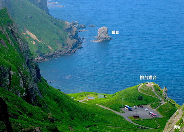 北側に巨大な桃岩、南側に猫岩が見える