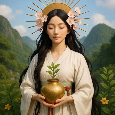 大山津見神の娘、須佐之男命(スサノオ)の妻です。大年神(収穫の神)と宇迦之御魂神(稲荷神・食物の神)の母であり、市場の守護神、農耕神、商業神として信仰されています。