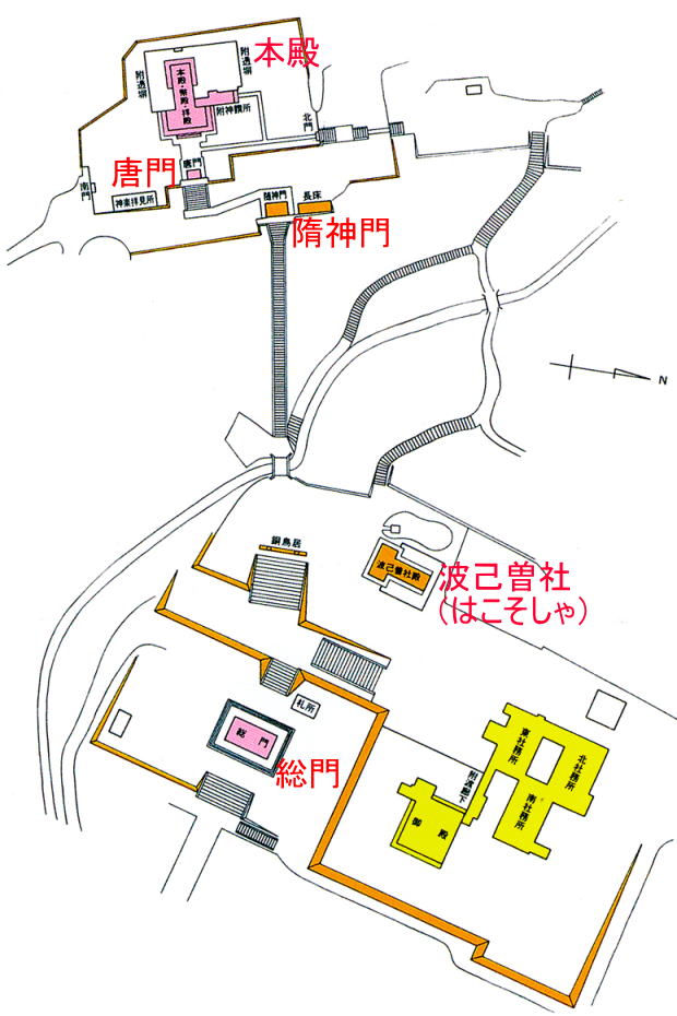 本殿拝殿をはじめとする境内の諸建造物は、江戸時代初期から中期にかけての建造物で、江戸時代建築の趣をもった壮麗なもので、老杉の巨木うっそうたる神域に、輪奥の美を連ね、高さ十メートルの旧御殿下の石垣をはじめとする各所の石垣は其の技工の巧なること比い無く、諸建造物青銅の大鳥居等と共に、文化財に指定されている。