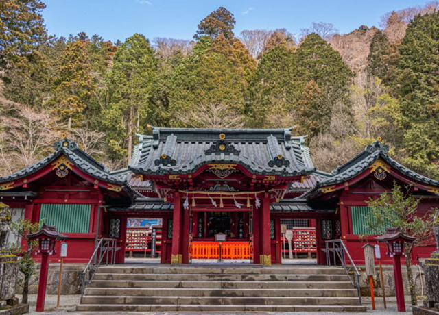 芦ノ湖のほとりにあり、関東総鎮守として知られています。鎌倉時代には源頼朝が特別の信仰と保護を与え、将軍家新年恒例の「二所詣」が行われました。