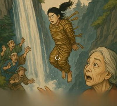 翌朝、旅の僧は少し離れて行ったと思うや否や、霧のごとく消えていきました。きっと薬師如来様の化身だったのだ、と与市は思いました。そうしたことがあったある日、薬師如来様が与市の夢枕に立たれました。「親孝行な与市よ、あなたの信仰心の深さを示すため、あの百丈が滝から跳び降りなさい。母親の眼は治ります。」